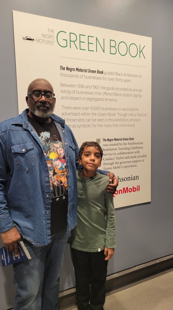 One of the reasons for our 4-hour excursion to Houston was to see the museum exhibit The Green Negro Motorist Handbook at the Holocaust Museum before it moved on to other pastures (in this case Los Angeles, CA). For those who don’t know, during the Jim Crow days the Green Negro Motorist Handbook was a way for Black people to travel the country with grace and dignity, and just live with the freedom that car travel provides, despite the laws that restricted our rights. There is an interactive display where you can navigate a trip to grandma’s house, and you can choose to use the handbook or go without, to your own peril.