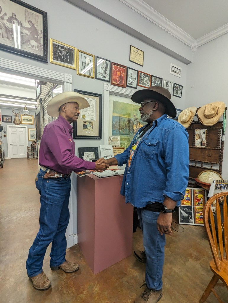 While the museum was small, there was an enormous amount of history there, and he proceeded to take us through it, imparting knowledge about how the Black cowboys survived, and in some cases, thrived. This also included Larry’s life as a Western musician before vocal Dysphonia took his vocal cords. He was also involved in the rodeos and showed us pictures of his own bull-riding exploits of him and his contemporaries. He also showed us actual sheriff and marshall badges, and one I had never seen before: badges worn by men whose job it was to round up escaped slaves. We also got to see a myriad of old west pistols, including a replica of Wyatt Earp’s Peacemaker, which for the life of me I couldn’t see how he could shoot it with how long the barrel was. We surmised the pistol was more ceremonial than anything else, and not something he would wear day to day.